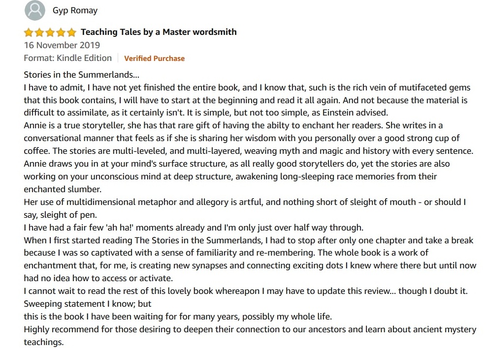 And so that is why I wrote Stories in the Summerlands, to guide others into the holy Mysteries that succeeding generations of Grailkeepers – since at least the days of the King Alfred the Great and the Templars – have buried in the cognitive mists of Avalon where they are not readily apparent to the modern-day spiritual tourist or pilgrim.