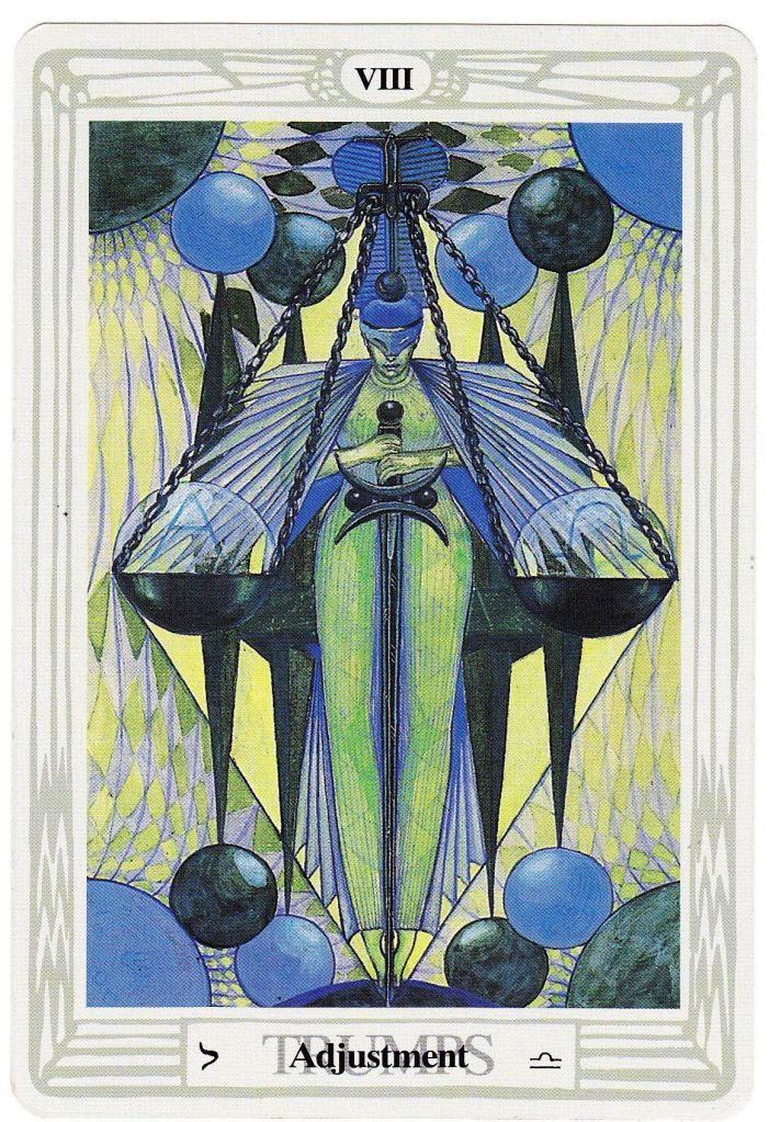 Justice is associated with Libra, which is why the symbol of Libra is the scales, as shown here in Frieda Harris’s illustration of Justice or Adjustment in the Major Arcana of the Thoth tarot.