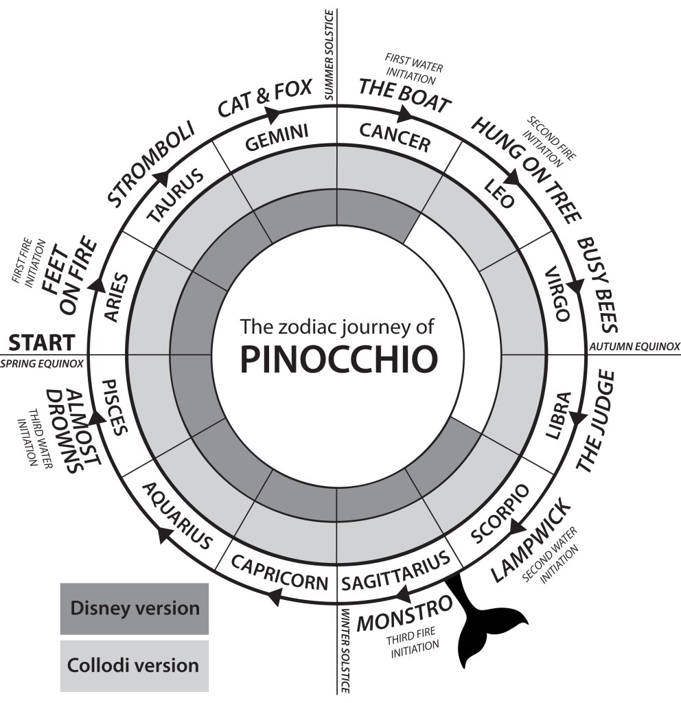 Every single mythological hero walks the circle of the constellations … even Pinocchio who, in the original story has 36 adventures … in other words, one for every decan of each of the 12 signs. I show in the following diagram the route he took in both the original folk tale, by Carlos Collodi, and also in the version for the Disney movie which, for the some reason, jumps from Cancer to Scorpio.