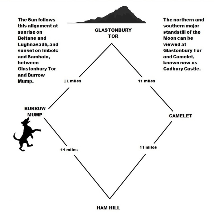 At the same time, the other side of the diamond line is ‘drawn’ by the passage of the Moon from Cadbury Castle to Glastonbury Tor. These are the two highest summits from which its furthest southern and northern points can be seen.
