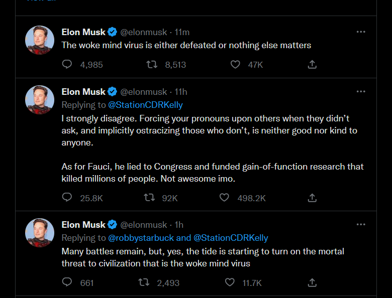 Elon Musk has expressed in interviews that he is afraid that the AI will be taken over by those with lower, less altruistic aims, and with certain social media like Facebook and Twitter, he has been able to watch that unfold. He is clearly against the Woke mind virus, which he believes is a mortal threat to civilisation.