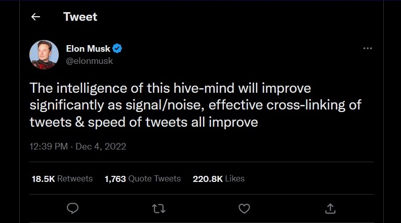 “The intelligence of this hive-mind will improve significantly as signal/noise, effective cross-linking of tweets & speed of tweets all improve.”