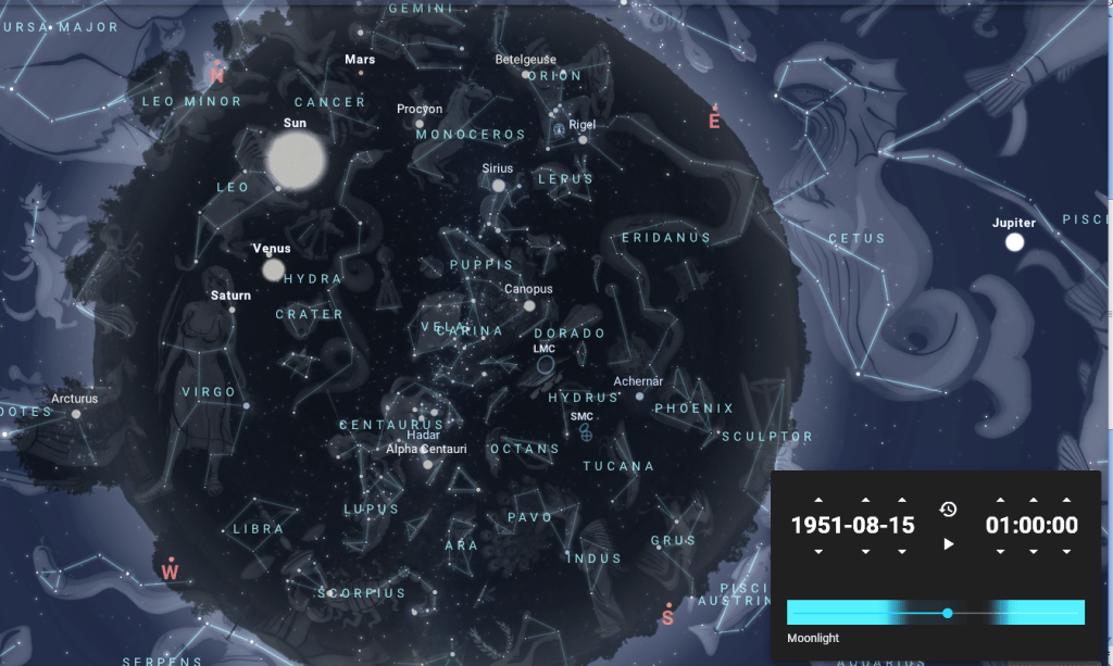 I was born in 1951, between Leo and Cancer, with Saturn at the head of Virgo – but with the loving touch of Venus hovering close by. (My Ascendant, as you can see, was between Orion, the underworld river of Eridanus and Cetus the Whale, which explains a lot! But that will have to be another story for another day.) Virgo is characterised by that very detailed, analytical to the point of nit-picking part of our cerebral processes – and I must say, my strict Saturnic schoolmaster has made sure that I have that quality big-time!
