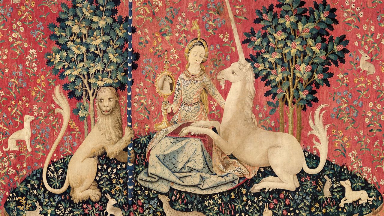 “… In this instance, the unicorn probably represents the beloved tamed. He is tethered to a tree and constrained by a fence, but the chain is not secure and the fence is low enough to leap over: The unicorn could escape if he wished.“Clearly, however, his confinement is a happy one, to which the ripe, seed-laden pomegranates in the tree—a medieval symbol of fertility and marriage—testify. The red stains on his flank do not appear to be blood, as there are no visible wounds like those in the hunting series; rather, they represent juice dripping from bursting pomegranates above.