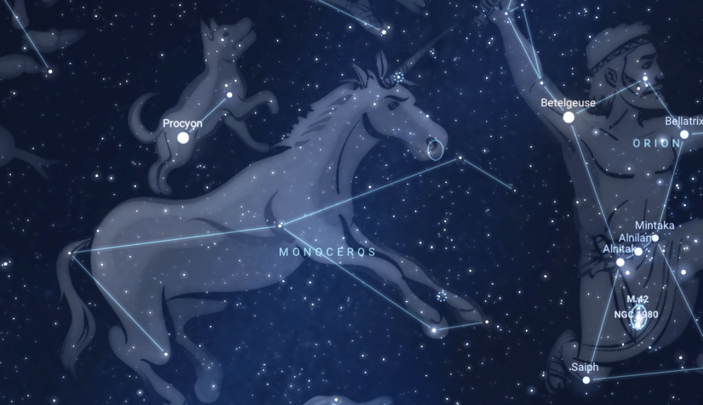 But it wasn’t until the 17th century that the unicorn constellation was discovered sparkling in the stars by Dutch theologian, geographer and astronomer Petrus Plancius. He named it Monoceros (one horned). And so that is what the lyrics of the Grinderman song are about.