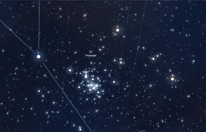Praesepe is Latin for ‘manger’, ‘cot’ or ‘crib’. Two of the stars of Praesepe are seen as asses eating hay; Asellus Borealis and Asellus Australis—aka the Northern and Southern Asses.